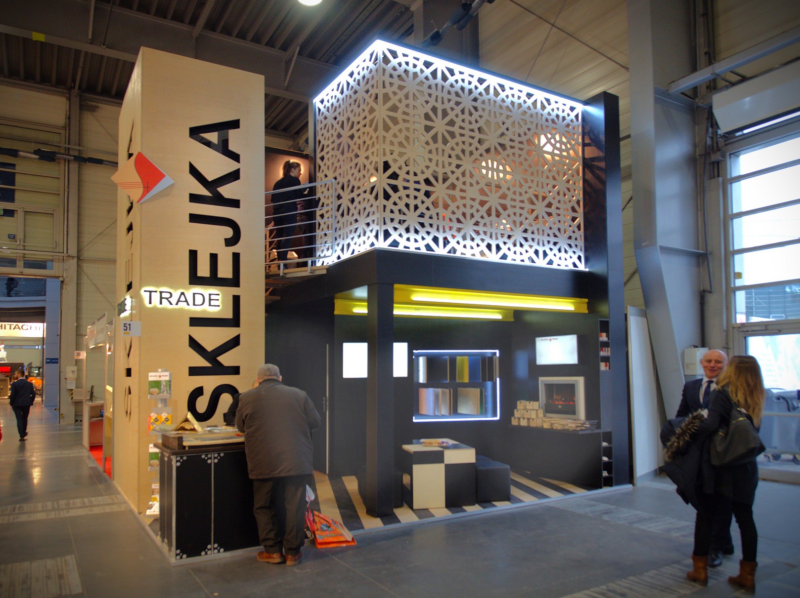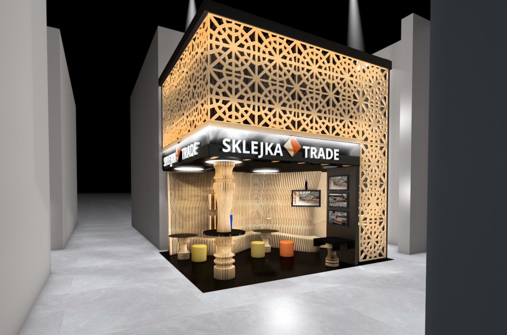Dodatkowym elementem stoiska jest antresola osłonięta ażurowymi ścianami, gdzie znajduje się komfortowa strefa VIP, przeznaczona do rozmów biznesowych i negocjacji z kluczowymi klientami.
