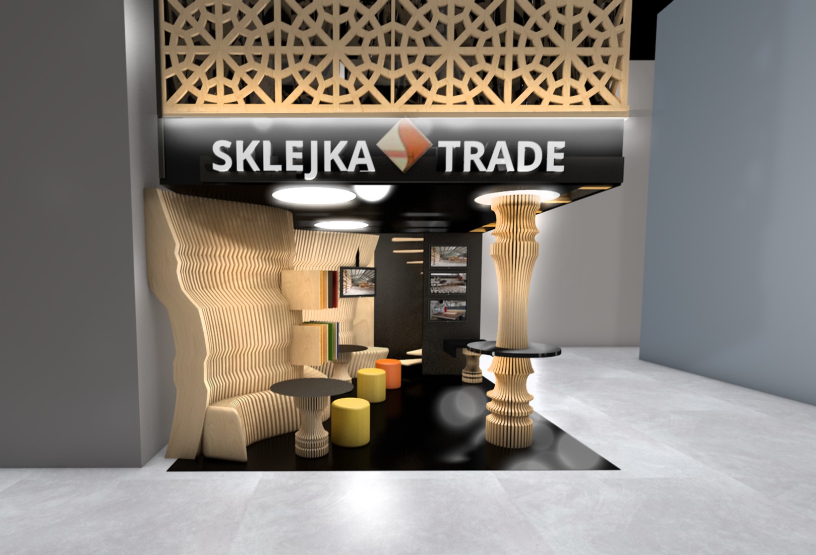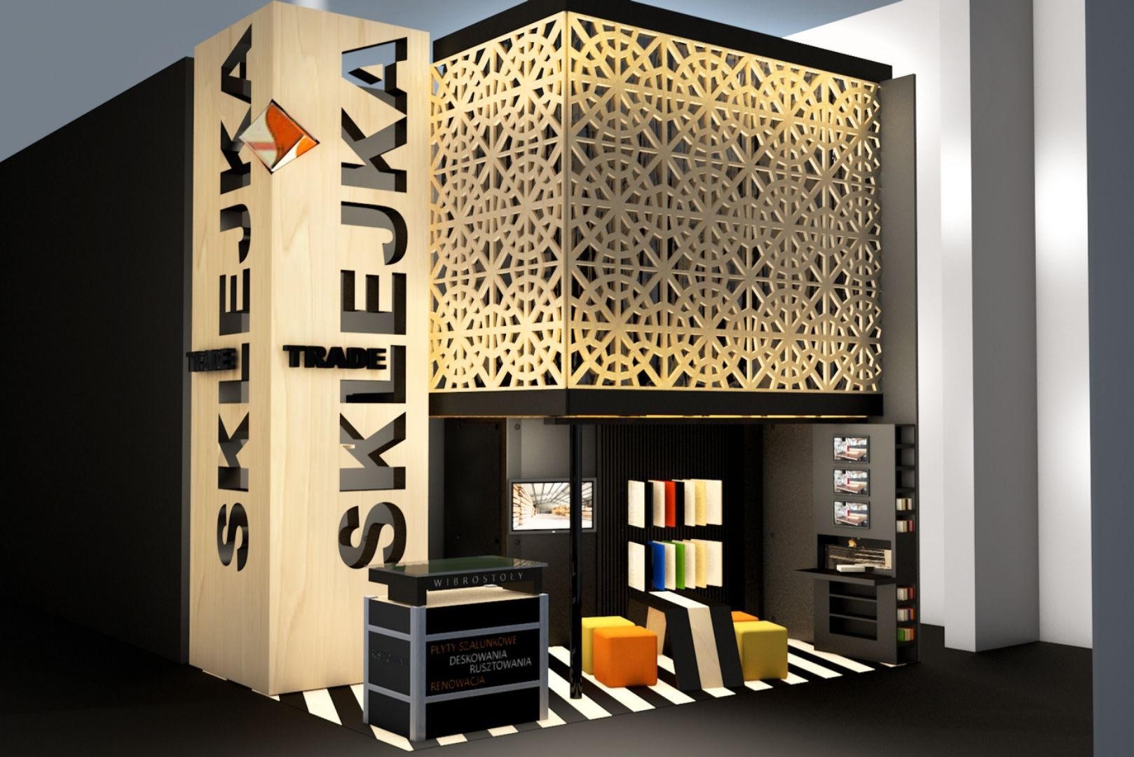 Stoisko targowe firmy Sklejka Trade na Budma 2016. Głównym założeniem projektu było stworzenie miejsca, które nie tylko eksponuje różnorodność materiałów, ale także pozwala na zapoznanie się z nowoczesnymi technologiami, takimi jak precyzyjna obróbka CNC.
